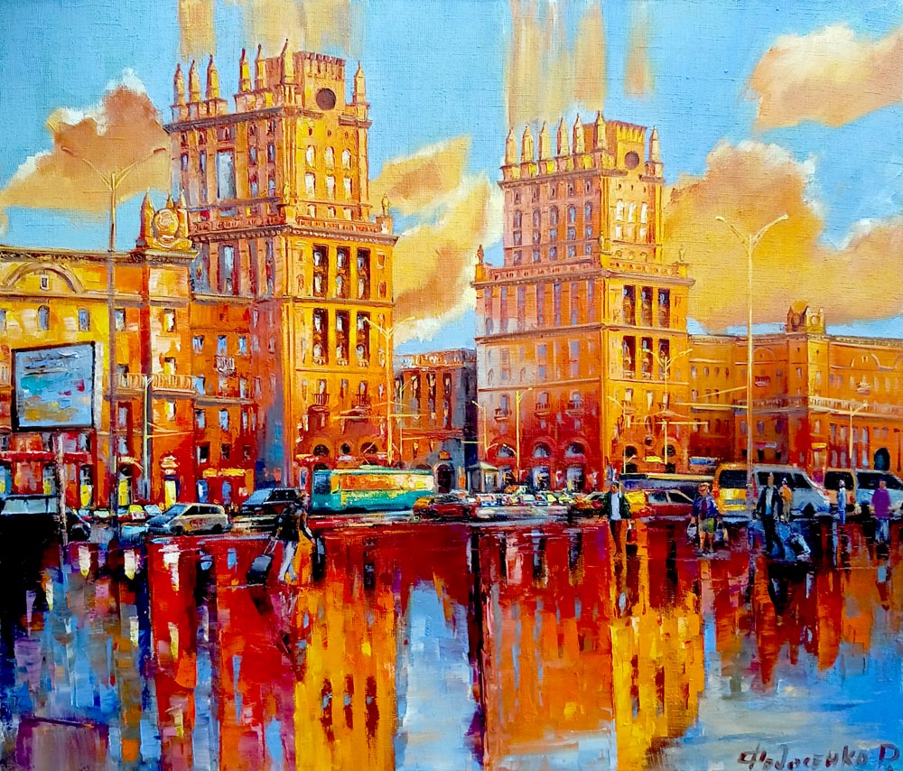 Это мгновение после дождя, когда город начинает сиять. Солнце пробивается сквозь облака, окрашивая сталинский ампир в золотистые, охристые и огненно-рыжие тона. Влажный асфальт превращается в зеркало, в котором отражается вся динамика большого города: огни автомобилей, силуэты прохожих и величие архитектуры.